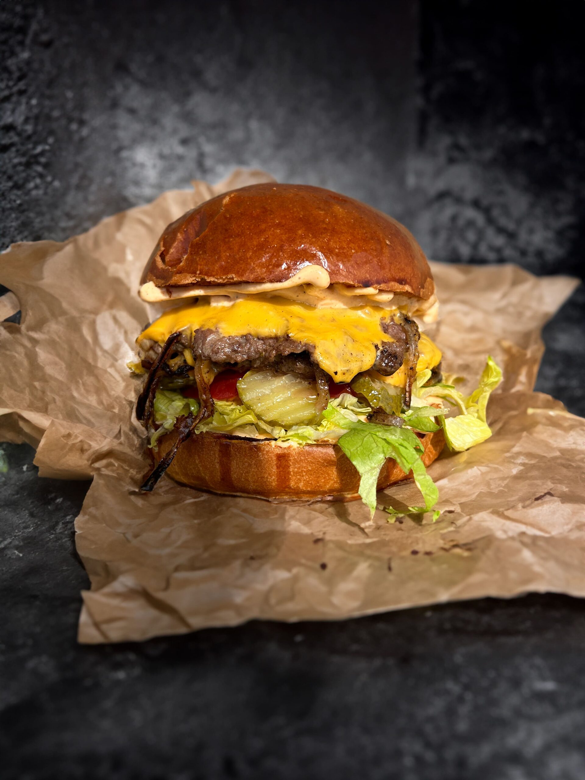 Brioch kruh, 160g 100% govedine, Cheddar sir, popečena čebula, Cheddar zos, okisana jalapeno paprika
